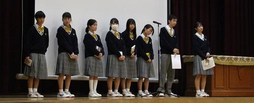 女子ソフトテニス部、弓道部、卓球部、男子ソフトテニス部、サッカー部、ダンス部、放送部、美術部、書道部、写真部、校内読書感想文 の表彰伝達式を行いました。 | |