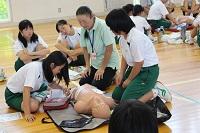7月13日(木)の午前中、1年生とPTA、教職員を対象とした心肺蘇生法講習会が行われました。西はりま消防組合太子消防署員の方より講義・実演していただき、ボランティアの応急手当普及員の方にも指導してもらい、心臓マッサージやAEDの使用方法などを学びました。