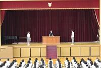 近畿大会に出場する生徒はステージに上がり、顧問の先生からは選手と部活動の様子の紹介があり、校長先生から激励の言葉が述べられました。
