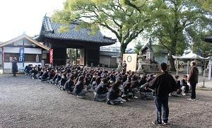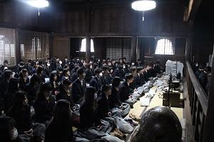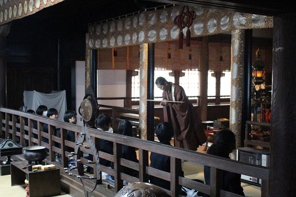 その後、天台宗の修行として坐禅止観(一般にいう座禅)と禅杖(禅宗でいう警索)の作法についての説明を受け、座禅体験をし、生徒の代表者が禅杖を体験しました。