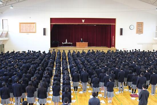 校長先生から、「1 年間の締めくくりの時期になりました。時間は皆さんに等しく流れてきましたが、それぞれ皆さんは今年をどんな言葉で締めくくりますか。今年は、国際交流として初めてオーストラリアからホームスティの生徒を10名受け入れ、一緒に授業を受ける体験をしました。また、2 年次は東北への修学旅行で震災体験、芸術鑑賞では狂言・能の世界を体験できました。12月23日~25日は、熊本へのボランティアに多くの生徒が参加します。熊本へもっていく花のポットは、全校生徒の一人ひとりが言葉と絵を描いてくれました。毎日毎日を過ごし、その中の小さな様々な経験から何かを学び、成長することはできます。冬休みを迎えます。その間に新しく出発する決意をした皆さんと会えることを楽しみにしています。成長している自分を感じられる冬休みにしてください。」とお話がありました。