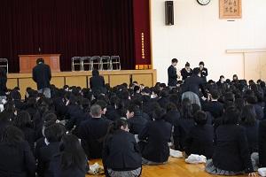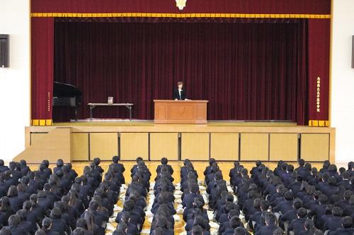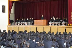 校長先生から、1 年間の締めくくりの時期となりました。本日の午後は、新入生200名を迎え、合格者説明会を行います。1・2 年前、どんな気持ちでこの日を迎えましたか。覚えていますか。皆さんが、太子高校に惹かれ、興味・関心をもったのは、先輩方の様々な活動の姿があったからではないかと思います。これからは、先輩の姿を追うのではなく、それを超える太子高校生になってほしいと思います。春休みには、何になら関心をもち、ひたすら努力し、自分を磨くことができるのか、考えてほしいと思います。一緒に努力できる学校にしましょう。と式辞がありました。