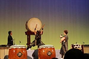『体験コーナー』 日本の太鼓である和太鼓の歴史、和太鼓 3 種類、「宮太鼓」、「桶胴太鼓」、「締太鼓」の違いについて、 舞台上にある大太鼓は樹齢500年のケヤキの木を繰り抜いて 2 頭の牛の革を張ってつくられていること などを説明していただきました。 その後、代表生徒 6 名は、和太鼓 3 種類と大太鼓の叩き方を教わりました。 生徒の叩く太鼓の音と、お手本で叩かれた太鼓の音は、響き、重みの違いを感じました。 体験コーナーの最後に、会場全員で、太鼓と拍手の三三七拍子をしました。 | |