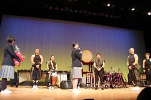 演奏後、代表生徒は、「今日は、私たちのために演奏をしていただきありがとうございました。色々な楽器を使って、様々な情景を表現できることを知りました。とてもかっこよかったです。」とお礼の言葉を述べました。そして、花束を渡しました。 | |