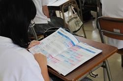 7月16日(水)5・6限、産業社会と人間の授業で、科目選択ガイダンスを行いました。ガイダンスでは、各教科担当からの、一つ一つの選択科目における内容、 目標、対象者、履修条件、の説明を聴きました。 教育課程表での選択群は、2年次は5群(A~E)、3年次は10群(F~O)あります。自分の進路に適した科目を選択できるよう、ガイダンス資料をしっかりと読み、よく考えた上で、選択科目を決定して欲しいと思います。 | |