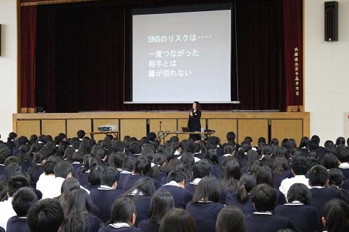 10月13日(金)の6校時、全校生徒、職員および保護者を対象とした消費者教育講演会がありました。NIT情報技術推進ネットワーク株式会社より講師に来て頂き、『SNSのリスク ~ここがあなたの正しいボーダーライン~』を演題として、講演していただきました。