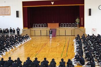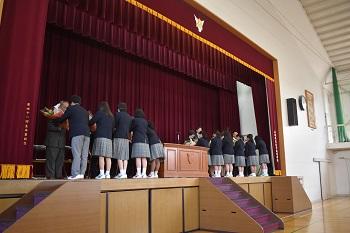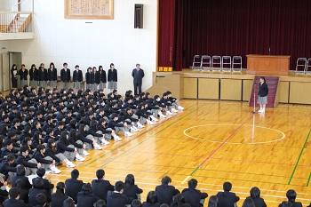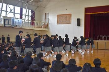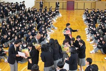 生徒副会長がお礼の言葉を述べました。 | 代表生徒より花束を贈りました。 |