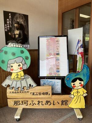 職員室前の廊下に、情報の授業で作成されたパンフレットが掲示されています。