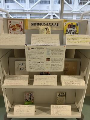 職員室前の廊下に図書委員のオススメ本が、置かれています。手書きのメッセージが添えられています。ぜひご覧ください。