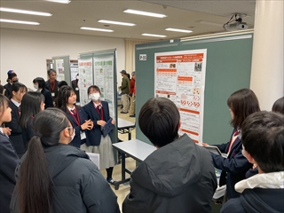 GS科2年生は、前日までスキー修学旅行で北海道を訪れていためんこ班とサーブ班が、疲れを跳ね除けて堂々と発表を行いました。GS科1年生の発表は、ミニ探究発表会の最優秀班が、化学部は1年生が新しいアルギン酸ゲルの合成方法についての発表を行いました。