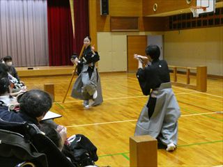 本校生徒による狂言「以呂波」と「蟹山伏」を披露するとともに、狂言体験として、「以呂波」の台詞や、「蟹山伏」の山伏の呪文などを、みんなで練習し、出演者の動きに合わせて全員で一緒に声に出したり、動いたりしてみました。