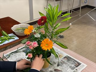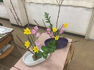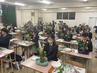 1回目は『盛花』を学びました。花材は、赤芽柳・ラッパ水仙・スイートピー・ルスカスです。主、副となる枝や花の選び方、高低差や角度、花器とのバランスを考え、花材の色や形の美しさを活かして造形的に生けます。剣山や花バサミに触れるのも初めての生徒たちは、恐る恐る生花にハサミを入れていましたが、先生方にサポートしてもらいながら楽しく生けていました。