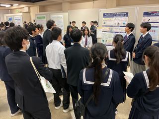 この研究は普通科「リス探」で行っている探究活動の一つで、お風呂でよく見かけるピンク汚れを身の回りの物質で抑制することを目的とした研究です。発表した二人は、これまで授業だけでなく放課後の時間も使いながら、熱心に研究に取り組んできました。ポスター発表を通して、多くの大学の先生から有益な助言を頂き、更に探究心が高まっている様子です。今後の研究の発展に注目していきたいところです。