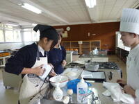 西山先生の他、本校の卒業生でもある専門学校2年生の生徒2名に、メレンゲの立て方のコツやサクサクの生地の作り方などを教えていただきながら、楽しくお菓子作りをすることができました。