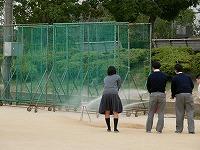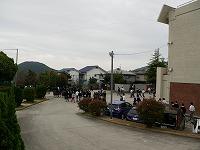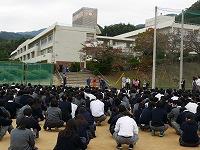 非常ベルが鳴り響き、非常放送により生徒たちはグラウンドへ