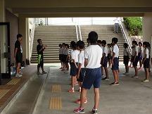 非常ベルが鳴り響き、非常放送により生徒たちはグラウンドへ