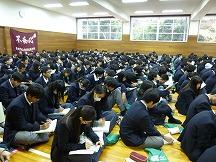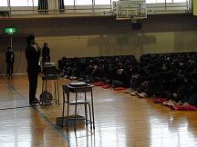 学校長が登壇しました。全員が舞台に注目します。今回の式辞は? ⇒ 詳細を読む