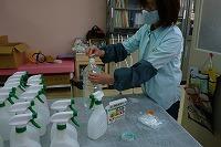 生徒の皆さんが安心して学校生活を再開できるように、消毒液を使って清掃をを行っています。