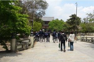 今年の2年生の校外学習は、現地集合。奈良公園内の興福寺五重塔前広場に電車を乗り継いで到着(それだけで緊張した人もいました)。興福寺、猿沢の池、東大寺と歴史的文化遺産もすばらしいものでしたが、鹿がおじきをして、鹿せんべいをねだる姿に癒されました。