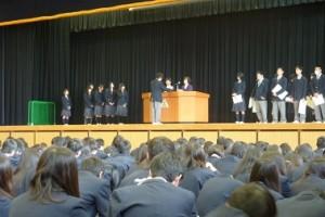 続いて表彰伝達式があり、部活動及び読書感想文等で優秀な成績を収めた生徒が壇上に上がり、学校長より順に表彰を受けました。