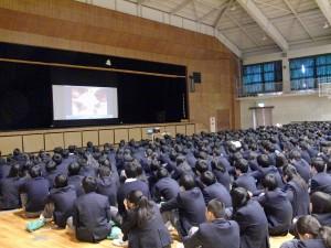 学校長が登壇しました。全員が舞台に注目します。今回の式辞は? ⇒ 詳細を読む