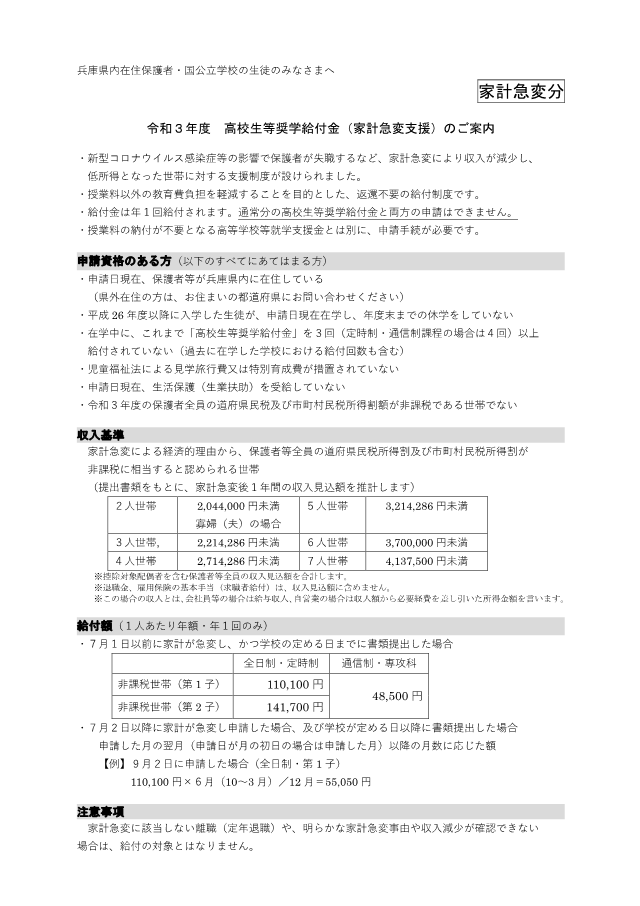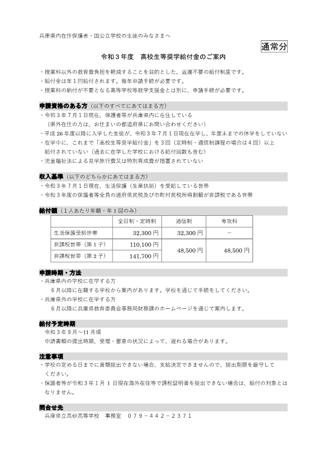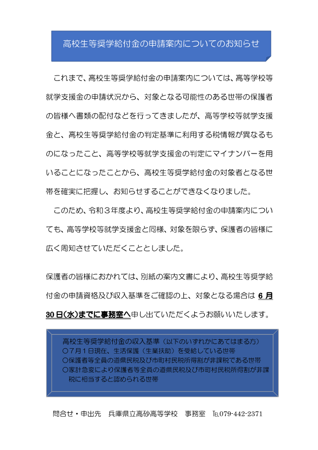 ご確認の上、本校生で対象となる場合は、6月30日(水)までに本校事務室まで申し出てください。