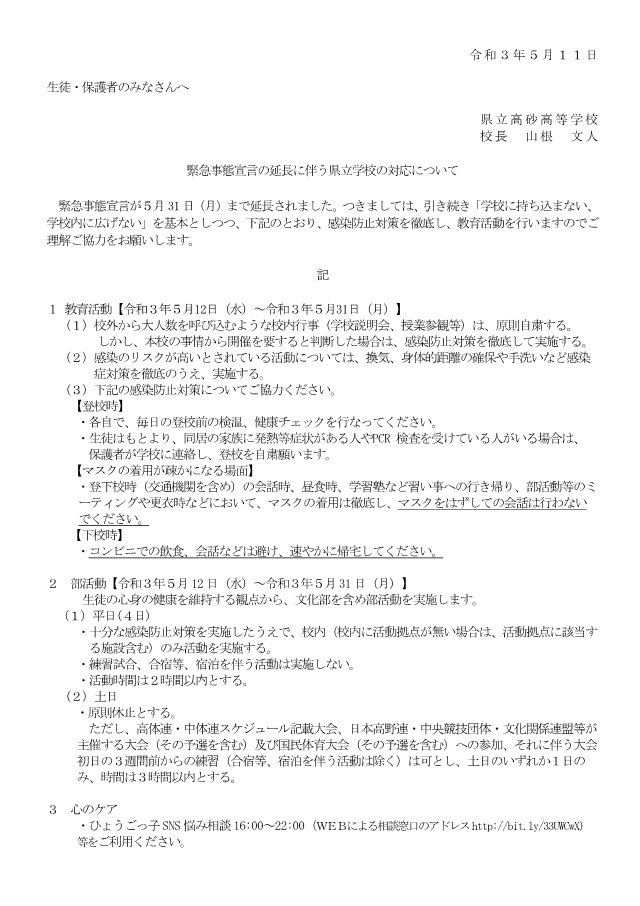 5/11 緊急事態宣言が延長されました。ひき続き、下記のとおり感染防止対策を行っていきます。ご協力ください。