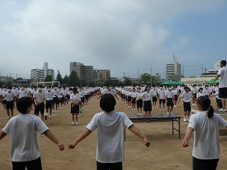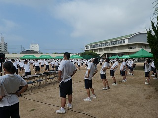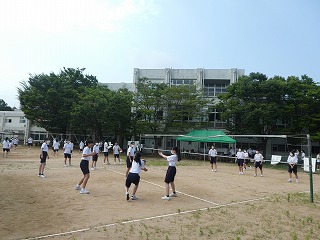 7月13日、14日 校内の球技大会を行い、それぞれ元気はつらつとしたプレイで盛り上がり、絆を深める機会となりました。3年生のスポーツ類型クラスの生徒が中心となって企画し、コロナ感染防止対策と熱中症対策を兼ねた大会運営を行いました。準備体操の後、競技に入りました。