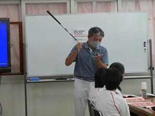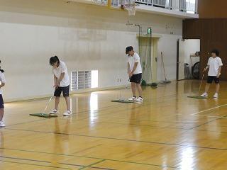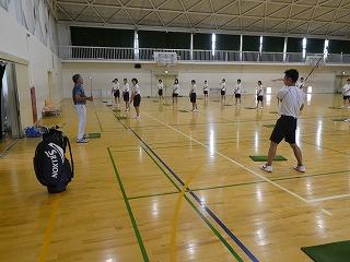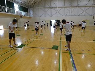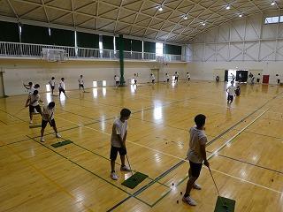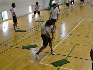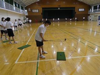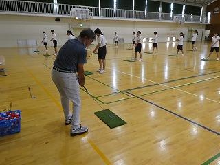 9月3日 スポーツ類型の3年生の生徒が、選択している保健体育の学校設定科目「生涯スポーツ演習」でゴルフの授業がはじまりました。特別非常勤講師 神田英明先生からゴルフスイングの基礎を教室でビデオを見て説明していただいた後、体育館で実際に振って指導していただきました。
