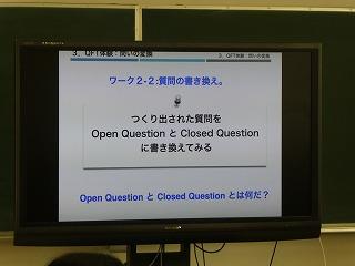 現在求められている学力3要素のうち、要素2(思考力・判断力・表現力) 要素3(主体性・多様性・協調性)を身に着けるために、探究学習が求められるとお話しされ、そのために各自が問題を見つけることが重要だとわかりやすく説明していただきました。問題を見つける(発見する)ための視点を養うために、「質問づくり」について説明を受け、ワークショップしました。