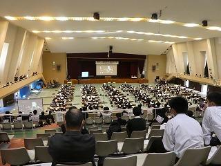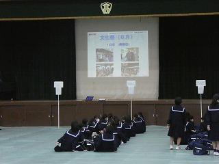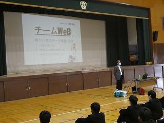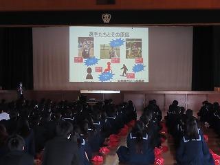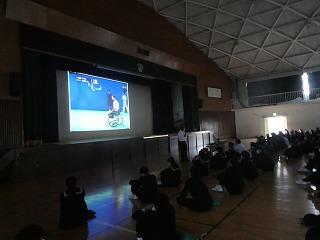 校長先生のあいさつからはじまり、小嶋様が、車いすバスケットの全国大会にボランティア参加された経験や障がい者スポーツの選手たちについて紹介を交えてお話をしていただきました。障がい者は、労災、交通事故、スポーツ事故、病気によってなっていて、特別なことでないと理解できました。