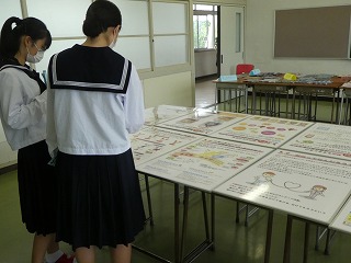 体育館に飾られた各クラスの学級旗をはじめ1年生の展示作品、文化部の作品も文化祭の雰囲気を盛り上げました。