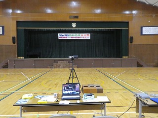 午前中のクラスの体育館ステージ発表は、感染防止対策の観点から、3年生だけ体育館で鑑賞、1学年、2学年は教室でオンライン鑑賞としました。