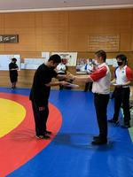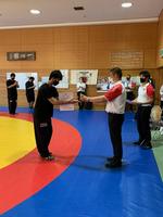 日下選手とスパーリング笑顔の神屋君 清岡選手に世界の技の伝授をうける大西君です