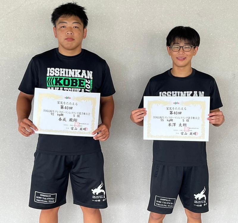 夏休みも後半戦を迎えた8月17~20日に、滋賀県は大津市「ウカルちゃんアリーナ」で全国グレコローマン選手権が開催されました。兵庫県の代表として本校からは、51㎏級野崎生穏(2年)、55㎏級米澤太朗(2年)、65㎏級西村量伍(2年)、80㎏級大西悠(2年)、92㎏級春成飛翔(3年)、125㎏級古段達基(1年)の6人が出場しました。激しい闘いの末、春成選手(3年)・米澤選手(2年)が5位入賞いたしました。
