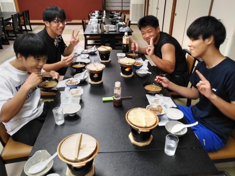 佐賀駅前にて。パートナーの森本君と神屋君も一緒に笑顔 古湯温泉 扇屋で夕食の一コマ。笑顔でピース。