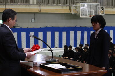 2月26日(木),記念品贈呈式が行われ,3年生から卒業記念品として青と白の「幔幕」が贈呈されました。