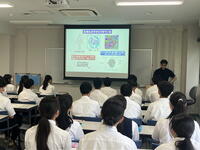 午前中は,京都大学大学院理学研究科を訪問し,杤尾豪人教授に講義をしていただきました。「生命現象をタンパク質の立体構造から理解する」と題して,タンパク質の結晶を原子レベルで立体的に可視化する方法や,タンパク質に分子が結合することで,生体の維持や機能発現に重要な役割を果たすこと等を教えていただきました。