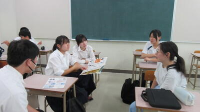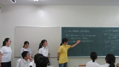 理学研究科では、教授の杤尾先生より「生命現象をタンパク質の立体構造から理解する」と題して講義・演習をしていただきました。タンパク質の構造やDNAの複製等について理解を深め、最後は鎌状赤血球ができる理由を話し合って考えました。