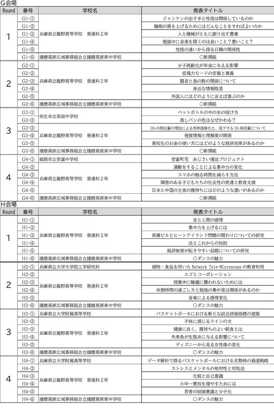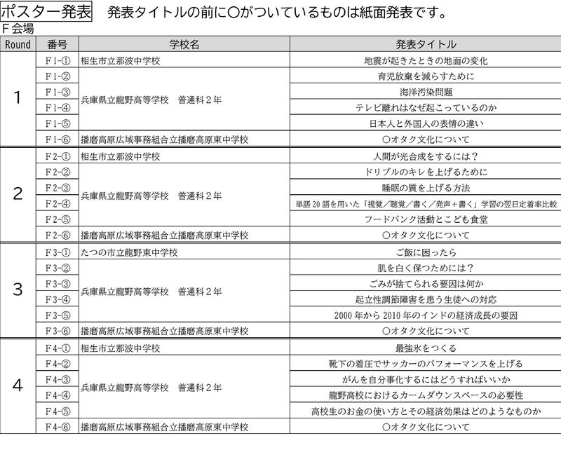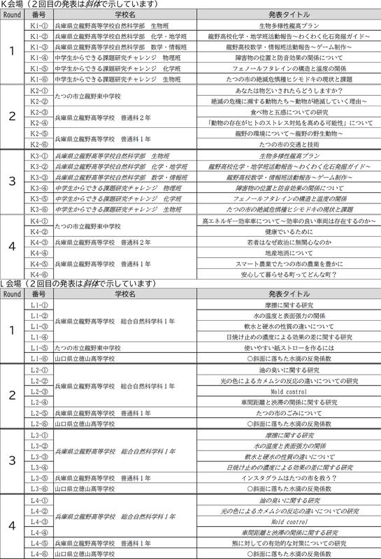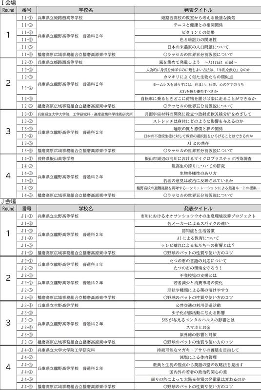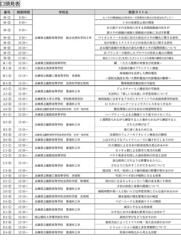4 時 程 ※変更になる場合があります。 8:20~ 受付(体育館1階) 5 参加について 参加費は無料です。 (1) 発表者の募集 口頭・ポスターまたはブース発表により、日頃の研究成果を発表してください。申し込み多数の場合は、発表数、発表形式を調整する場合があります。中高生の発表者については、教員・保護者による引率をお願いします(引率者についても(2)より申し込んでください)。 令和7年11月21日(金)までに龍野高校ホームページにアクセスして申し込んでください。発表形式、タイトル等を申し込んでください。申し込み後に、確認メールを送付します。令和7年12月12日(金)までに確認メールに返信する形で、発表要旨(龍野高校ホームページに様式あり)を提出してください。 ア 口頭発表(日本語のみ)について 発表時間は15分(質疑応答を含む)です。パワーポイント等のスライド資料の他に当日は発表に必要なパソコン等を準備してください。プロジェクター・HDMIケーブル・ポインタは会場(体育館または教室)のものを使用できます。 イ ポスター発表(日本語のみ)について 設定時間(20分間)で聴講者が集まり次第発表してください。A0(縦1189 mm×横841 mm)サイズ1枚とします。掲示するボード、マグネット・指示棒は会場(教室)のものを使用できます。その他、必要なものがある場合は準備して下さい。 ウ ブース発表について 大学教員・企業の研究者等を対象に、ブース発表(展示を含む)会場を設定します。詳細については、申し込み後、個別に連絡いたします。 (2) 聴講者の募集 発表者以外の参加者(引率者を含む)は、令和8年1月23日(金)までに龍野高校ホームページにアクセスして申し込んでください。