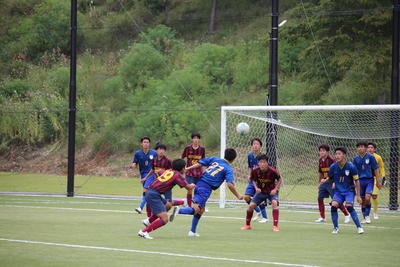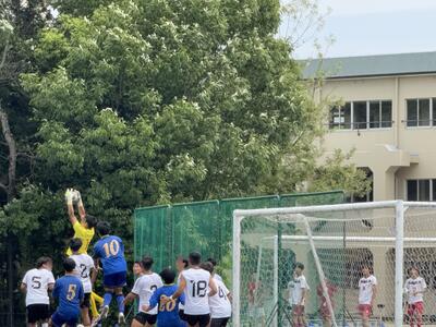 試合は予想通り、こちらのシュートが良いコースを突いても止められてしまうなど攻め込んでも返される状況が続きました。逆に攻め込まれる場面もありましたが、本校も集中した守備で応戦し、前半はスコアレスで終了。