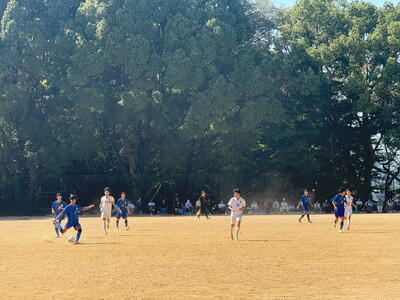 後半も両チームともに積極的に攻め合う展開となりました。攻撃の流れを掴んだ中、我が校のディフェンスラインの選手が果敢に駆け上がり、見事なゴールを決めて再びリードします。