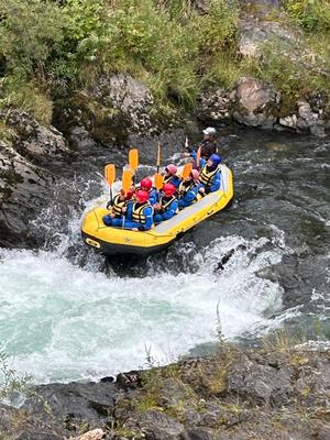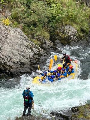 2日目も快晴、日差しは暑いですが、空気は涼しく感じます。各クラス準備を終え、ラフティング、クラス別研修に出発しました。
