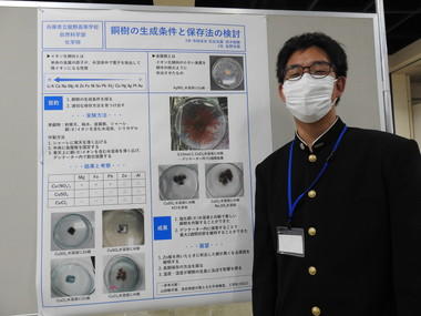 研究を進めていた2年生の春山くんは、1年生の頃からこつこつと実験データを積み重ねてきました。また、外部発表でもらったアドバイスを元に実験方法や解析方法を考え試行錯誤をしながら研究に取り組んでいました。今までの地道な努力で勝ち取った優秀賞だと思います。
