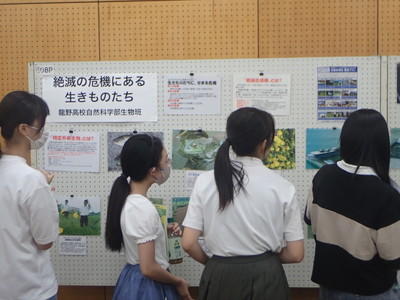 高校生によるポスターセッションは、県内の高校から19チームが参加しました。龍野高校からは、生物班(生物多様性の保全に関して3チーム)、課題研究ヌマエビ班が参加し、他校の高校生やフォーラム聴講者、研究者に対してポスターを使用して研究発表しました。