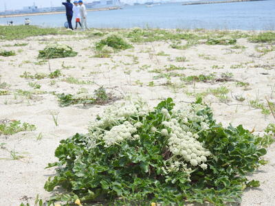 コマツヨイグサやミチバタナデシコなどの外来種も多いのですが、ハマボウフウやコウボウムギ、ハマゴウなどの在来種も多く生育しており、人工海浜とは分からないくらいに植生が発達していました。