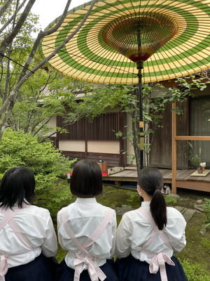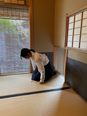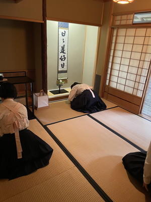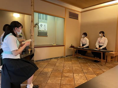 立礼、薄茶点前、野点見学・四畳半体験という3つのブースをローテーションで体験しました。四畳半体験では、普段の部活動では経験できないにじりぐちからお茶室に入る体験を初めて経験し、部員一同とても勉強になりました。