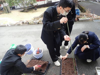 また、授業「探究」で実験に使用するヒシとヒシモドキを採集しました。これまでの研究でヒシモドキがヒシと似た生育環境で育つ植物だが、ヒシが繁栄しヒシモドキが絶滅する原因として、「種子の機能」「根の機能」などの差があることは分かっています。今回の実験ではヒシモドキが絶滅危惧種になった原因の一つに、「除草剤などの薬剤耐性が極めて乏しいため」という仮説を検証する予定です。