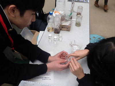 子どもたちに解説をしながら、高校生も多くの学びがあったと思います。今回は自然科学部の生徒だけでなく、有志生徒もボランティア指導員として参加していただきました。