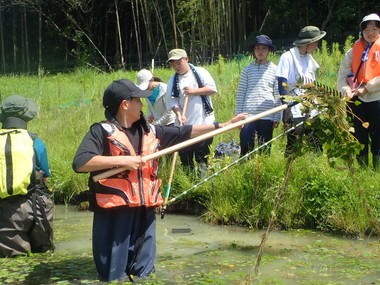 7月28日、太子町総合公園柳池周辺でフィールドワークを行いました。太子町まちづくり課の理解と協力により、龍野高校自然科学部や課題研究生物多様性班は、公園内のため池や荒れ地などを利用して西播磨の絶滅危惧植物の保全など生物多様性に関するいろいろな活動を行って言います。